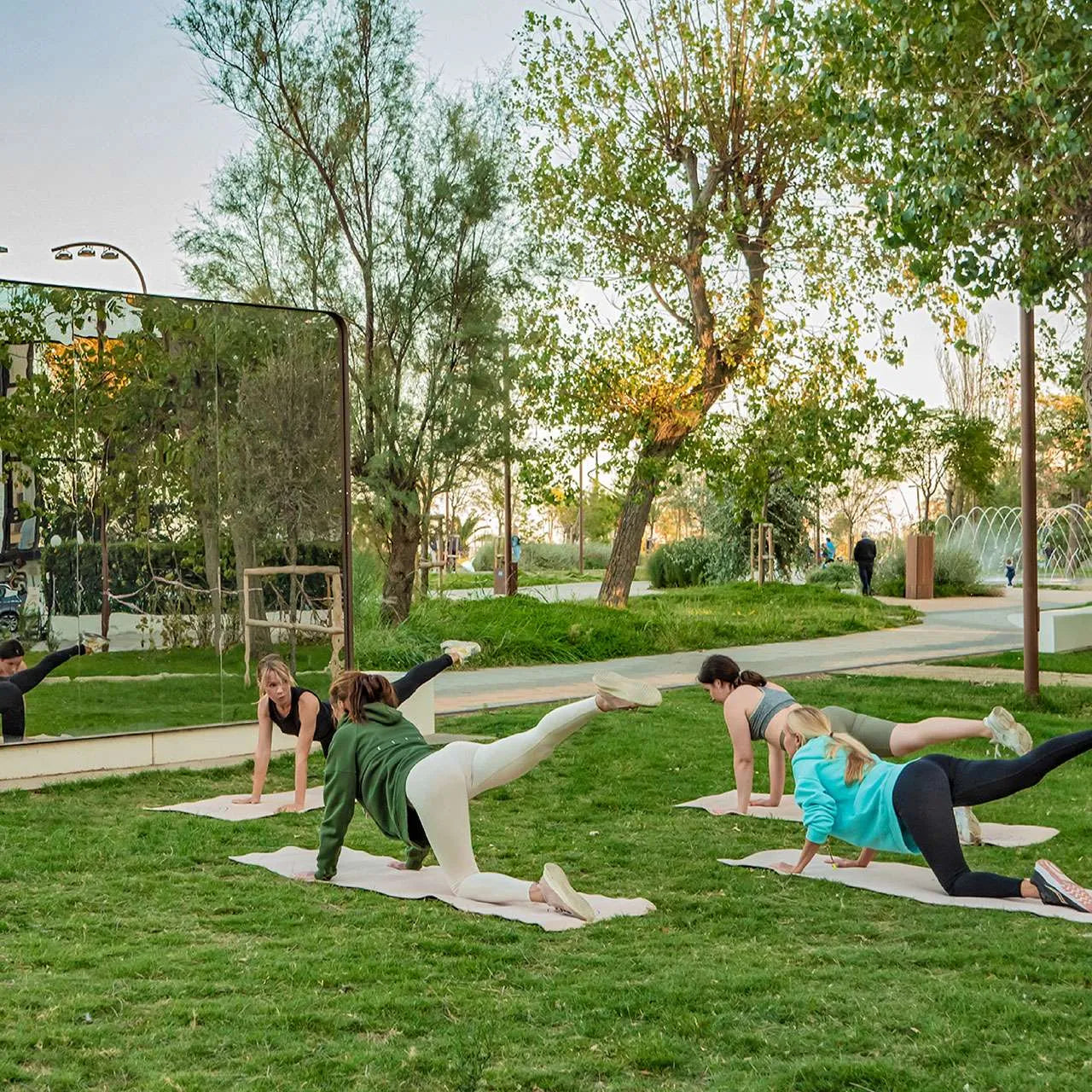 A tribute to the “selfie generation”: Choreography & Yoga Circuit embodies the ability of reflective surfaces to create a new social language that encourages interaction